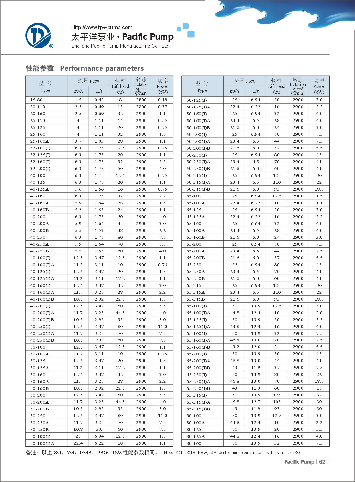 ISG series single-stage single-suction vertical pipeline centrifugal pump is the second generation of high efficiency energy-saving product designed by our company based on many years of production experience as per the performance parameters stated in the internatonal standard ISO2858 and the national standard JB/T6878.2-93.It is an ideal substitute for normal pumps like SG and D multi-stage centifugal pumps. The series has a flow range of 1.5-1600m3/h and a lift head range of 5-125m, which includes many specifications like basic, diversion and cutting types. According to the difference in working medium and temperature as well as meterial and structural changes of the flow-through part, it can designed and manufactured into TPRG hot water pump,IHG pipeline chemical pump and YG pipeline oil pump with the same performance parameters. Accordingly, this series can be widely applied to replaced the normal centrifugal pump completely to be used in all cases.